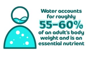 ​Water accounts for roughly 55-60% of an adult’s body weight and is an essential nutrient for every cell, muscle, and organ. ​